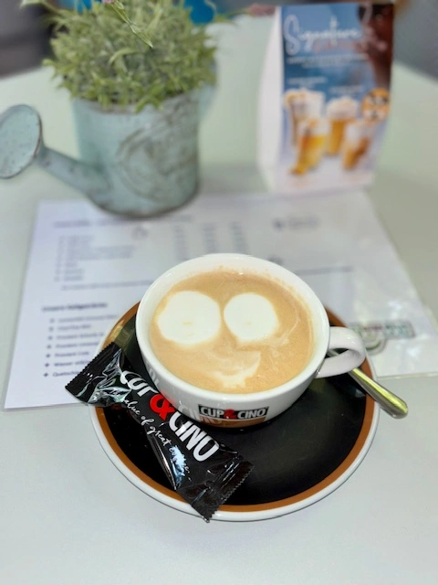 Ob Cappuccino, Latte Vanila, Ice Kakao oder Tee - hier ist für jeden etwas dabei. Unser Rezeptionsteam zaubert dir gerne eine unserer Kaffeespezialitäten von Cup&Cino.